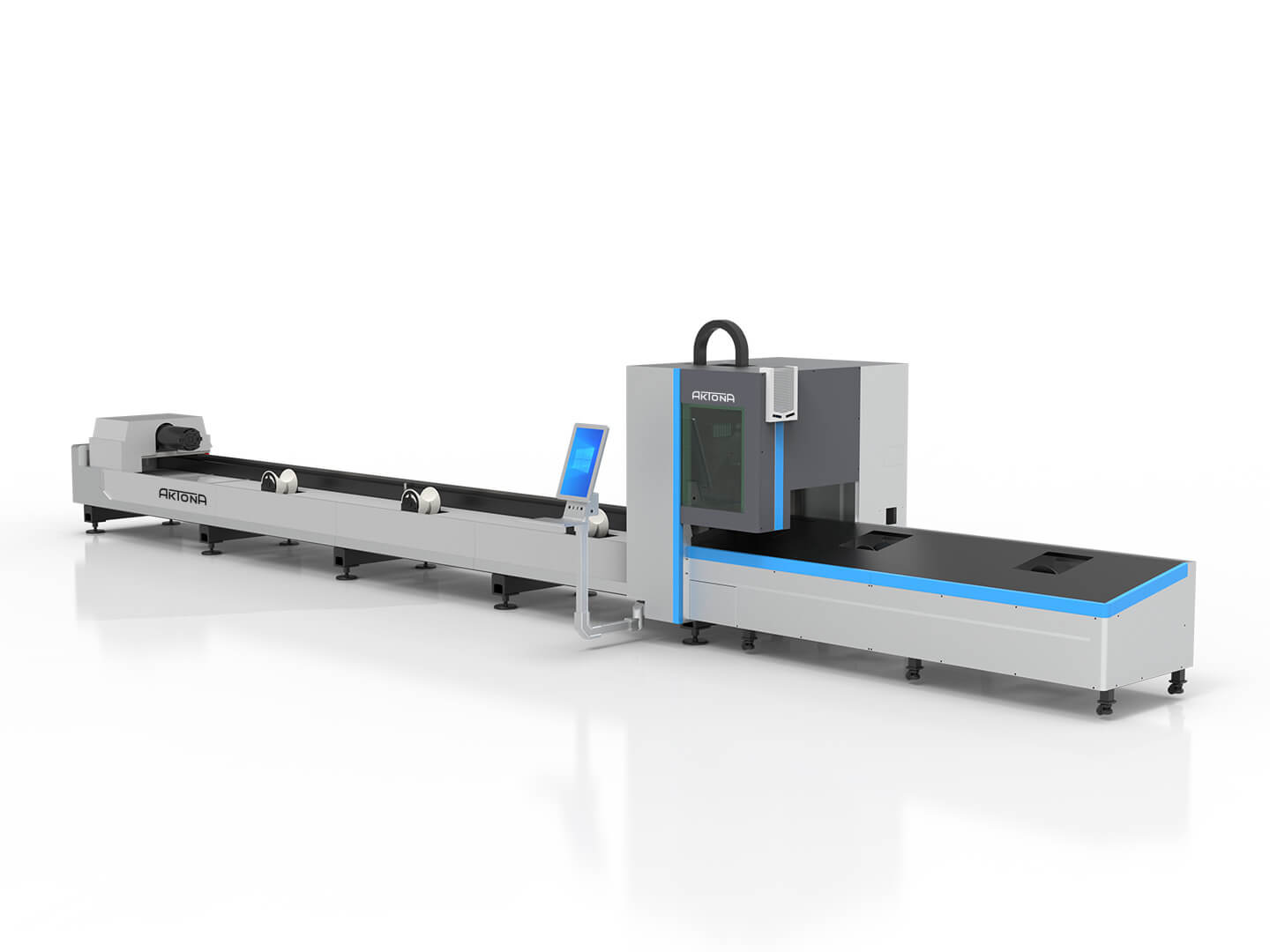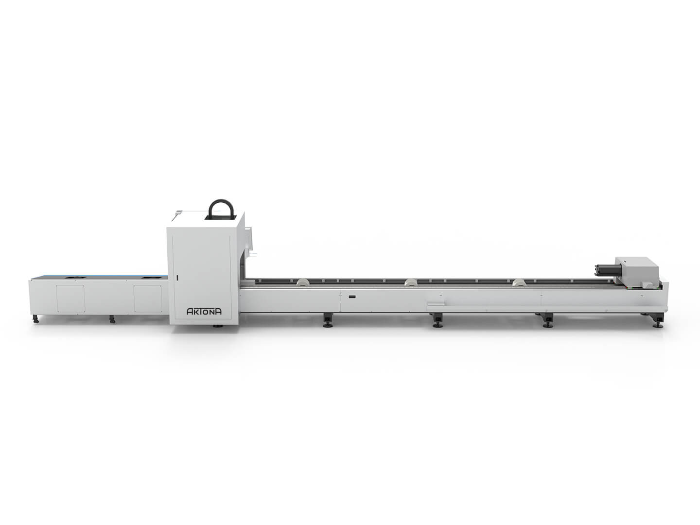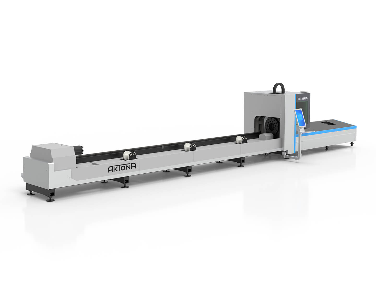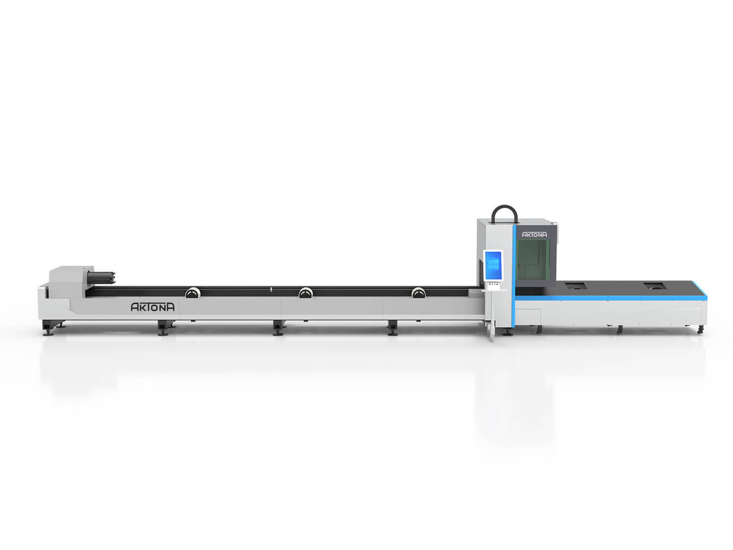 Wycinarki laserowe fiber z serii Aktona 60R to profesjonalne urządzenia przeznaczone do cięcia rur i profili. Maksymalna długość obrabianych elementów wynosi 6 metrów. Maszyna przystosowana jest do ręcznego załadunku materiału. Odbiór detali może odbywać się ręcznie lub z wykorzystaniem dodatkowych stołów odbiorczych – rolkowych lub wyposażonych w system „follow-up”, umożliwiający automatyczne podążanie za materiałem i kontrolę jego wysokości podczas odbioru.