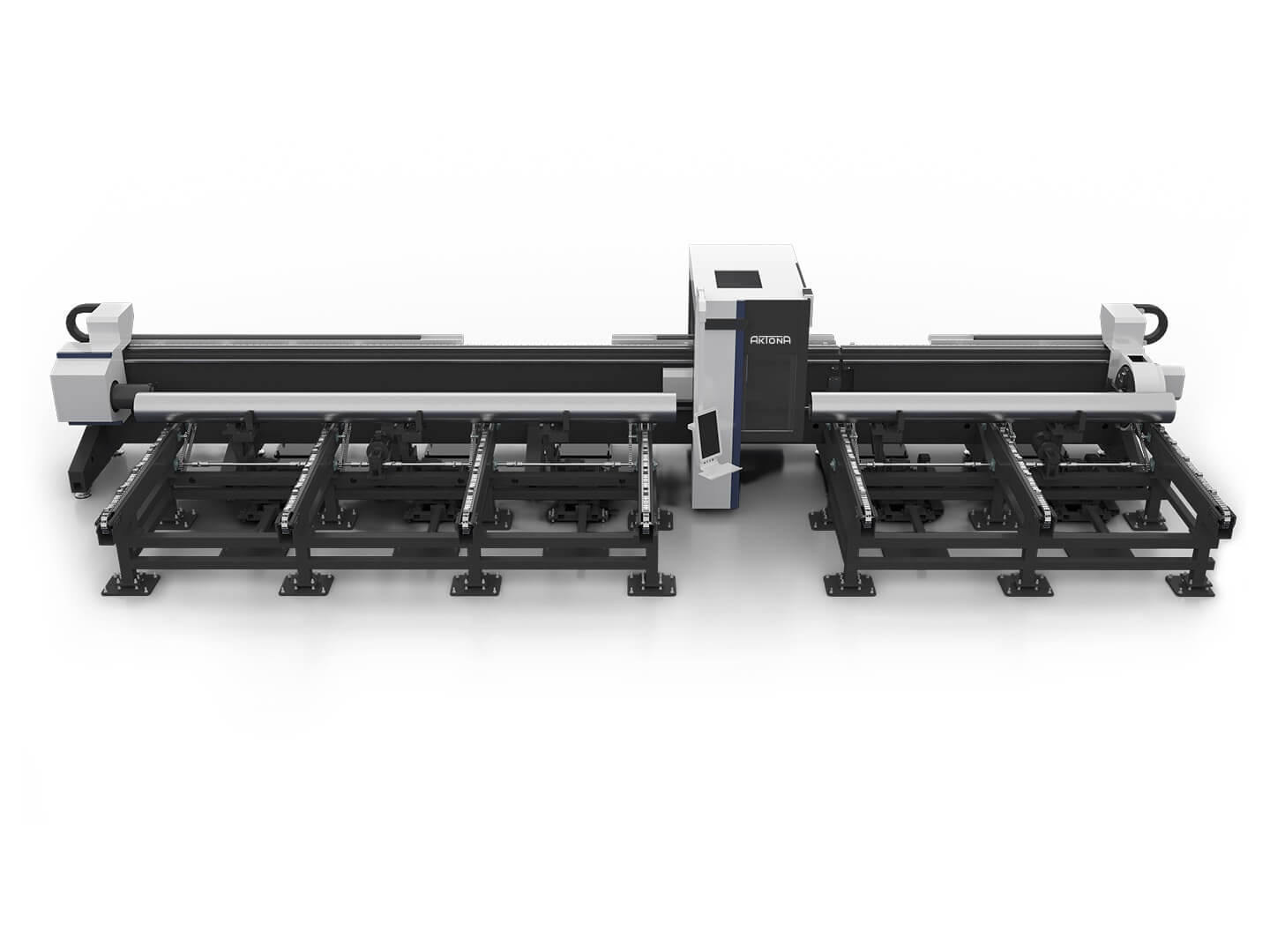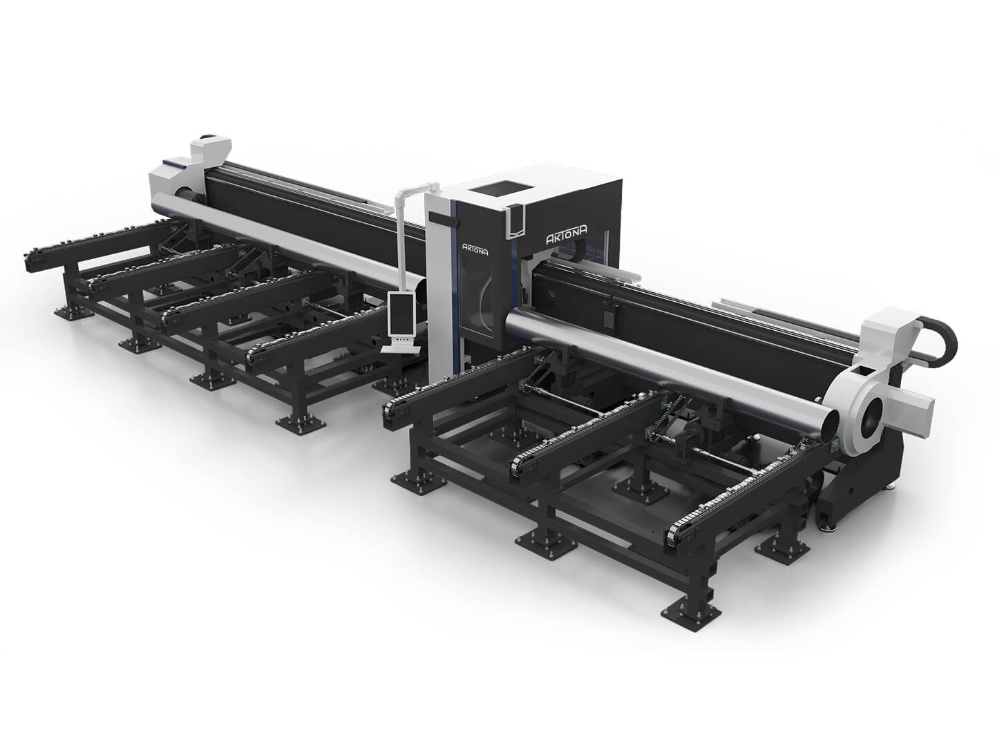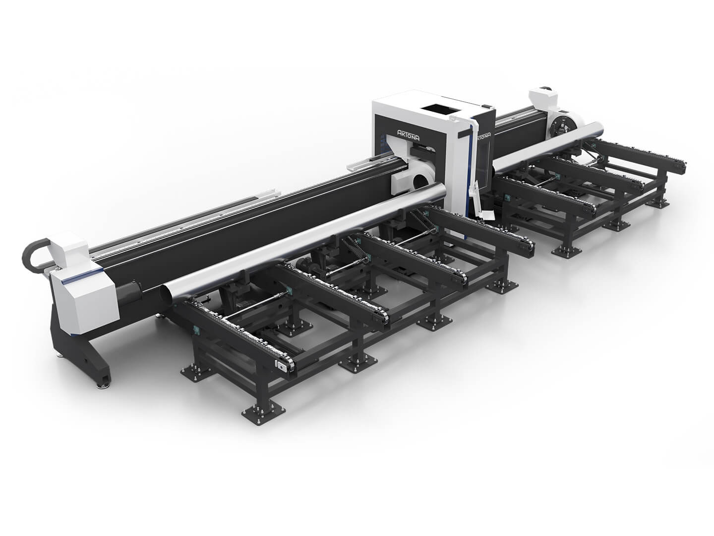 Wycinarki laserowe fiber z serii Aktona SN3 to profesjonalne urządzenia przeznaczone do obróbki ciężkich i długich rur oraz profili. Wycinarka wyposażona jest w trzy uchwyty szczękowe do stabilnego mocowania materiału, dzięki czemu podczas cięcia możliwe jest uzyskanie zerowych strat surowca. Dodatkowo trzeci uchwyt eliminuje efekt opadania rury w trakcie obróbki, co umożliwia precyzyjne odcinanie długich i ciężkich detali o średnicy nawet do 630 mm. Rura lub kształtownik może być obrabiana na długości do 12 metrów np. wykonywanie samych otworów. Maszyna może zostać wyposażona w podajniki oraz odbiorniki rur lub dostarczona w wersji przeznaczonej do ręcznego załadunku i odbioru materiału.